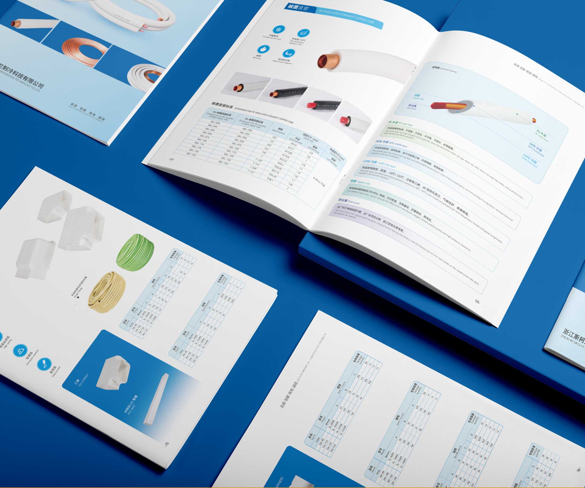 3. 冷色系專業視覺設計: 設計上緊扣行業屬性,主色調采用代表制冷、科技與專業的藍色系及灰色系,營造冷靜、可靠、高效的視覺氛圍。運用清晰的信息圖表、技術參數對比表及系統原理示意圖,將復雜的制冷循環、能效數據等轉化為易于理解的視覺語言。